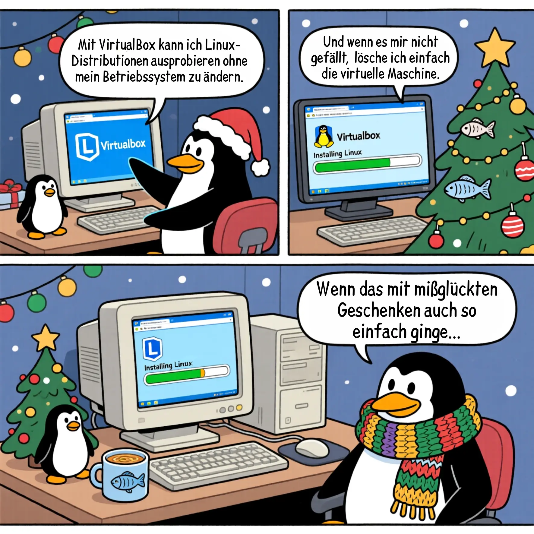 VirtualBox (www.virtualbox.org) ist ein kostenloses OpenSource-Programm für Linux, Windows, macOS und Solaris, mit dem Ihr auf Eurem Rechner einen "zweiten Computer im Computer" starten könnt – zum Beispiel ein extra Windows, Linux oder ein Testsystem, ohne Euren echten PC anzufassen. So könnt Ihr neue Betriebssysteme und Software gefahrlos ausprobieren, weil alles in einem abgeschotteten Fenster läuft und Euer eigentliches System dabei geschützt und unverändert bleibt. VirtualBox ist eine "Virtualisierungssoftware": Sie tut so, als wäre in Eurem PC noch ein weiterer kompletter Computer mit eigener Festplatte, eigenem Arbeitsspeicher und eigenem Betriebssystem. Dieser virtuelle Rechner läuft in einem Fenster auf Eurem Desktop, das Ihr wie ein normales Programm öffnen und schließen könnt. Ein Betriebssystem installiert Ihr üblicherweise, indem Ihr eine ISO-Datei in das virtuelle DVD-Laufwerk einlegt und davon bootet. Mehr dazu, was Virtualisierung ist, erfahrt Ihr in meinem Video "Linux begreifen 1: Linux installieren und Grundbegriffe wie "Distribution" und Co.". |