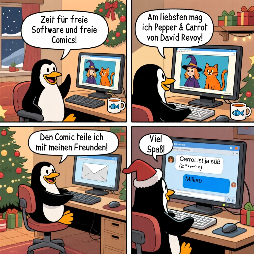 Entstehung: Die Comics wurden mit KI nach meinen Prompts erstellt und von mir mit IOPaint und GIMP nachbearbeitet und anschließend in Inkscape mit Text versehen. |