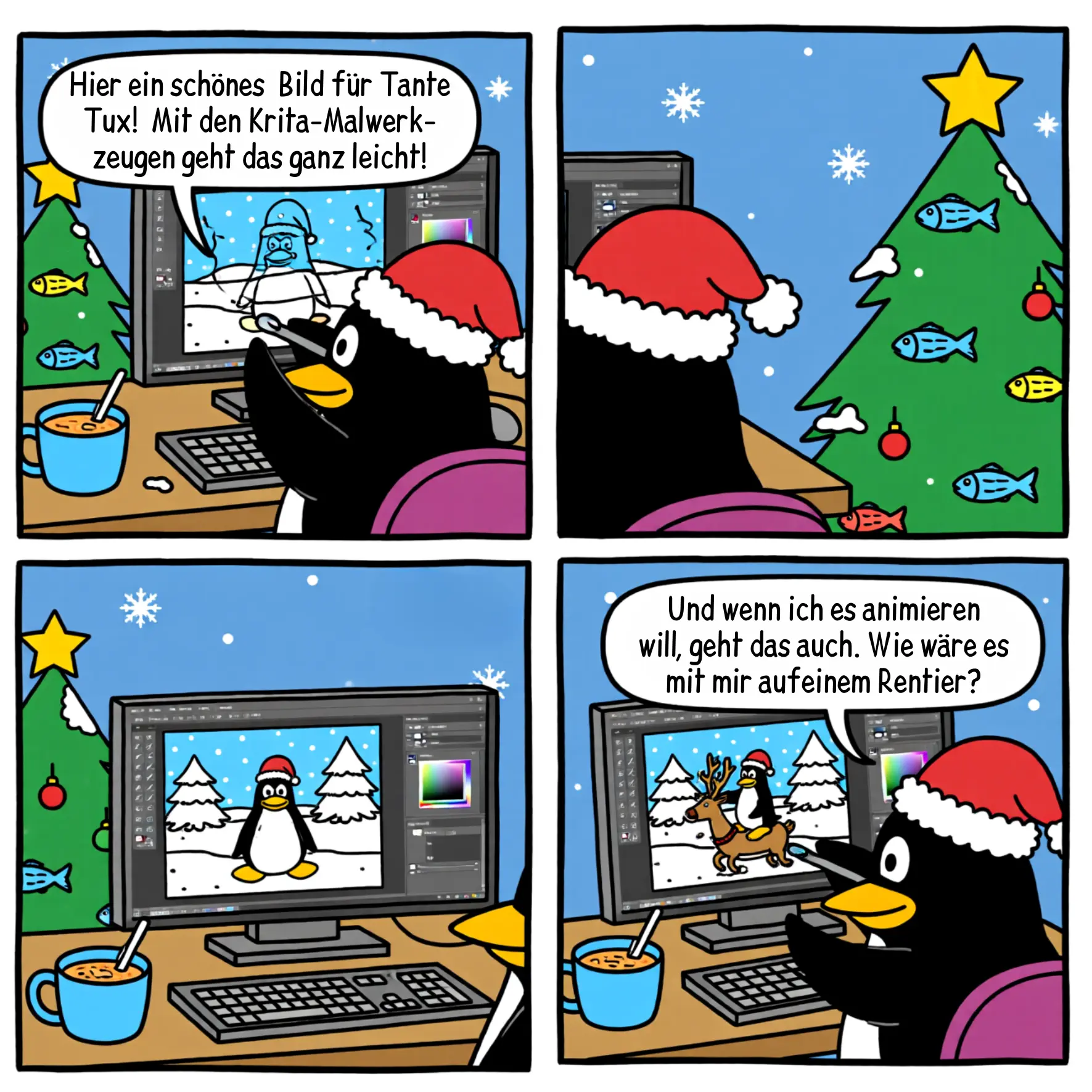 Krita (krita.org/de) ist ein kostenloses OpenSource-Mal- und Zeichenprogramm für Linux, Windows, macOS und Android, das Ihr auf dem Computer oder Tablet benutzen könnt. Mit den verschiedenen Werkzeugen ist es fast so, als würde man mit echten Pinseln und Farben arbeiten.