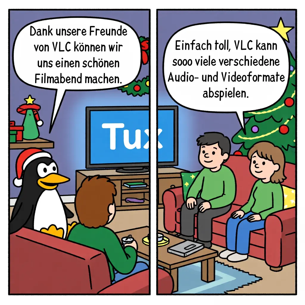 VLC (www.videolan.org/vlc) ist ein kostenloses OpenSource-Programm, mit dem Ihr fast alle Arten von Musik- und Videodateien auf dem Computer oder Handy abspielen könnt, ohne Euch um komplizierte Formate kümmern zu müssen. Es ist leicht zu bedienen und läuft auf vielen Systemen wie Windows, macOS, Linux und auch auf Smartphones. Ihr könnt eine Weihnachts-Playlist aus Musik oder Videos erstellen und als Wiedergabeliste speichern, um sie bei Familienfeiern oder mit Freunden einfach durchlaufen zu lassen. |