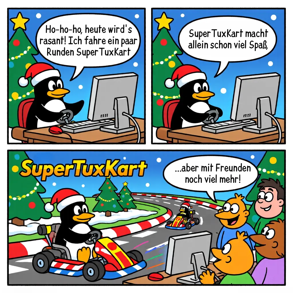 SuperTuxKart (supertuxkart.net) ist ein kostenloses OpenSource-3D-Kart-Rennspiel für Linux, Android, Switch Homebrew, Windows und Mac, das total viel Spaß macht – genauso wie Mario Kart, nur mit den Charakteren aus der freien Software-Welt, z.B. dem Pinguin Tux oder dem GNU Gnu. Auf verschiedenen Strecken fahrt Ihr gegen Eure Freunde oder den Computer, sammelt Power-Ups wie Kaugummies, in denen die Mitspieler beim Überfahren klebenbleiben oder Bowlingkugeln, um andere von der Fahrbahn zu kegeln und könnt Spielmodi wie Grand Prix, Zeitfahren oder Multiplayer wählen. |